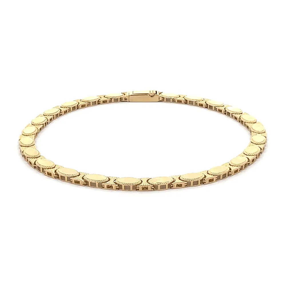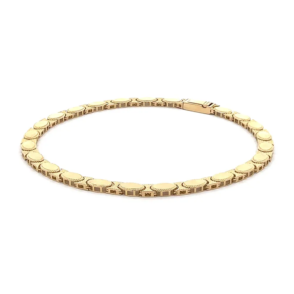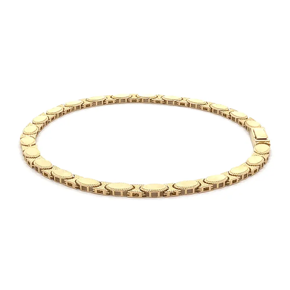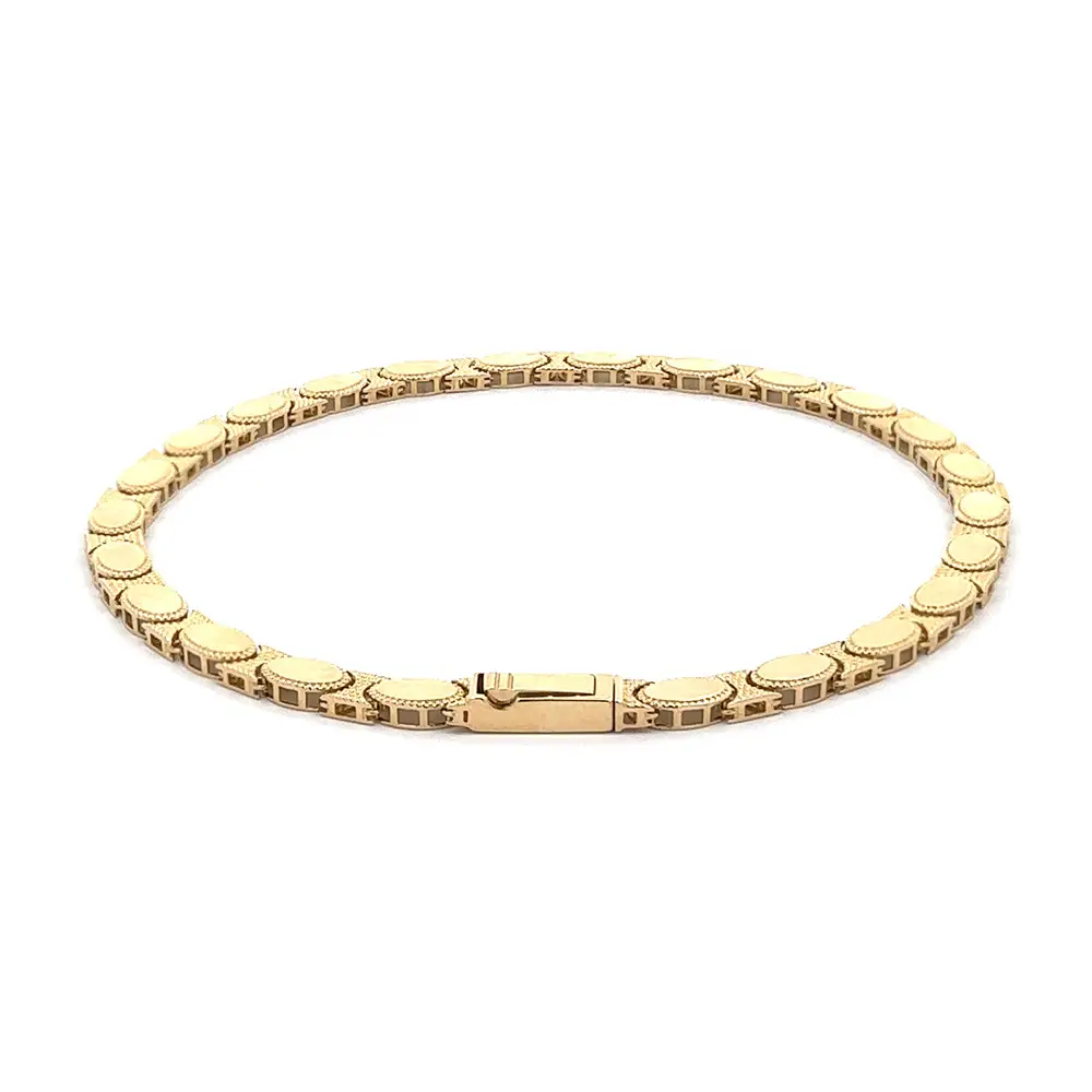 Zlatý náramek s oválnými články představuje klasickou eleganci a precizní zlatnické zpracování. Každý článek je jemně tvarován do oválné podoby a orámován decentní texturou, která dodává celému šperku hloubku a lesk.
