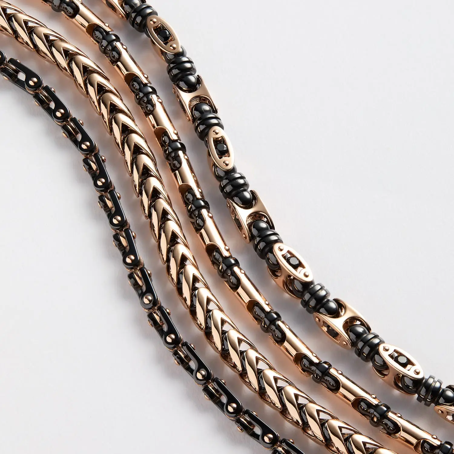 Další ikonickou řadou je Eternity, oslavující sílu vztahů prostřednictvím prstenů a náramků s výraznými symboly nekonečna. Kolekce Black Ceramic zase ukazuje, jak lze spojit tradiční luxusní kovy s inovativními high-tech materiály. Zancan rovněž tvoří exkluzivní diamantové linie, které dodávají pánským šperkům nový rozměr elegance.