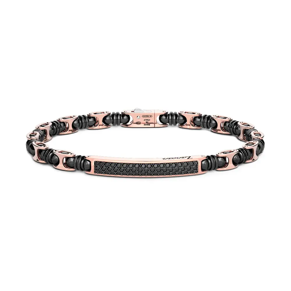 Dominantním prvkem modelu jsou černé diamanty o celkové hmotnosti 2,30 ct, jejichž hluboký odstín vytváří působivý kontrast vůči zlatu i černé keramice. Právě kombinace drahých kamenů a moderní keramiky propůjčuje náramku sebevědomý, luxusní výraz a vizuální originalitu. Design je odvážný, přesto elegantní a snadno kombinovatelný s dalším šperkem i každodenním stylem.