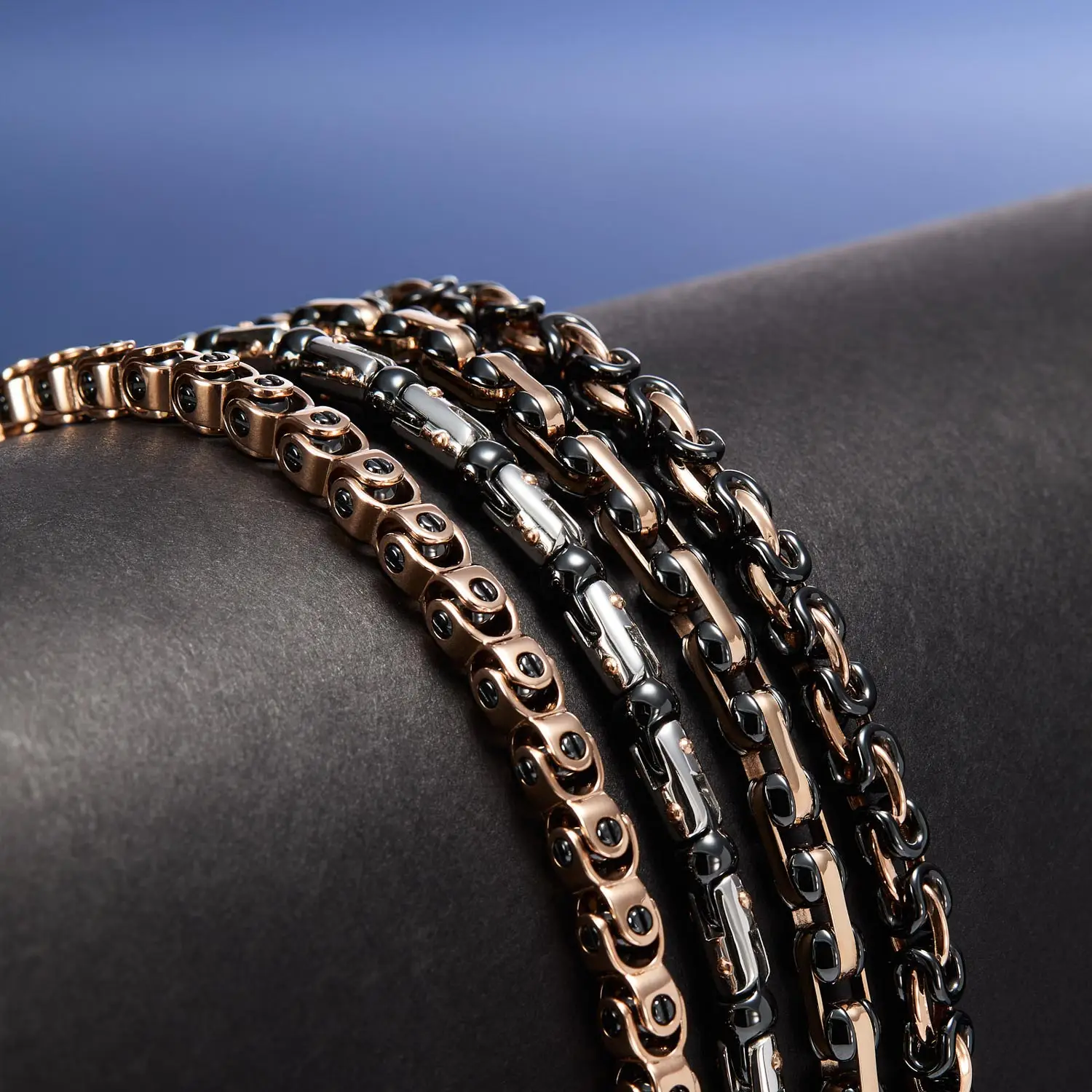 Další ikonickou řadou je Eternity, oslavující sílu vztahů prostřednictvím prstenů a náramků s výraznými symboly nekonečna. Kolekce Black Ceramic zase ukazuje, jak lze spojit tradiční luxusní kovy s inovativními high-tech materiály. Zancan rovněž tvoří exkluzivní diamantové linie, které dodávají pánským šperkům nový rozměr elegance.