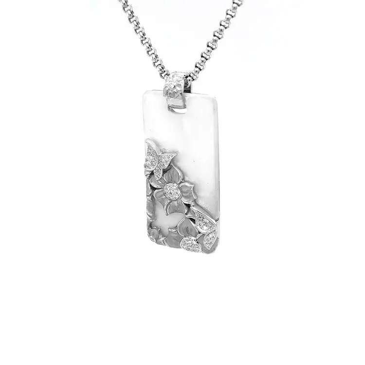 Dominantou přívěsku je přírodní bílá perleť vybroušená do tvaru emerald, která vyzařuje klid a ženskou něhu. Tento drahokam symbolizuje čistotu, intuici a vnitřní harmonii, což je v souladu s motivem motýlů – ztělesněním svobody, proměny a lehkosti bytí. Přívěsek doplňuje 46 přírodních bílých diamantů o celkové hmotnosti 0,42 ct, s brusem Round a velikostmi 0,90–1,60 mm, které září v barvě H a čistotě VS, dodávajíce šperku jemný, nebesky třpytivý efekt.