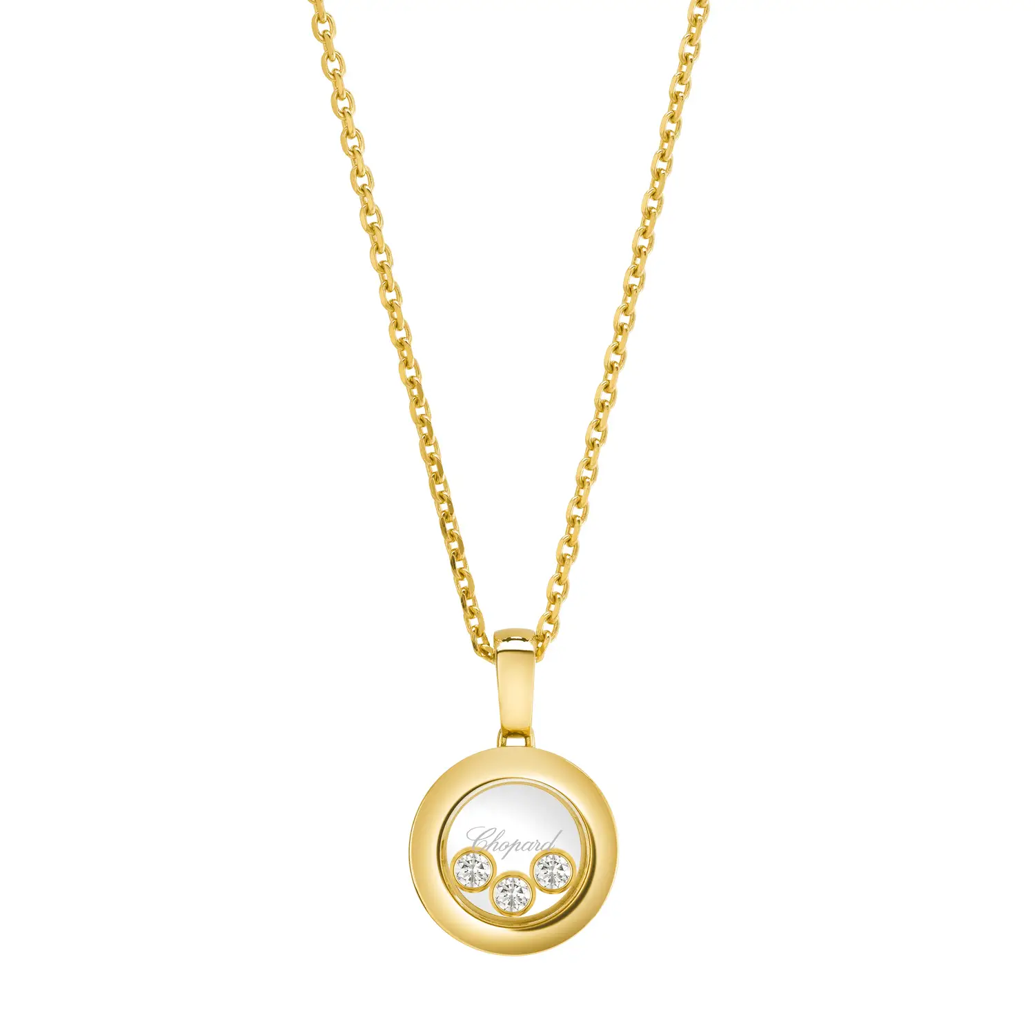 Přívěsek Chopard Happy Diamonds Icons 79A018-0001 představuje harmonii elegance, světla a pohybu. Vyroben z 18karátového etického žlutého zlata, zdobí jej tři volně pohybující se diamanty umístěné mezi dvěma safírovými sklíčky – ikonický prvek kolekce, který zachycuje světlo a přináší šperku živý třpyt. Jemné kulaté linie přívěsku podtrhují jeho nadčasový charakter a ženskou jemnost.