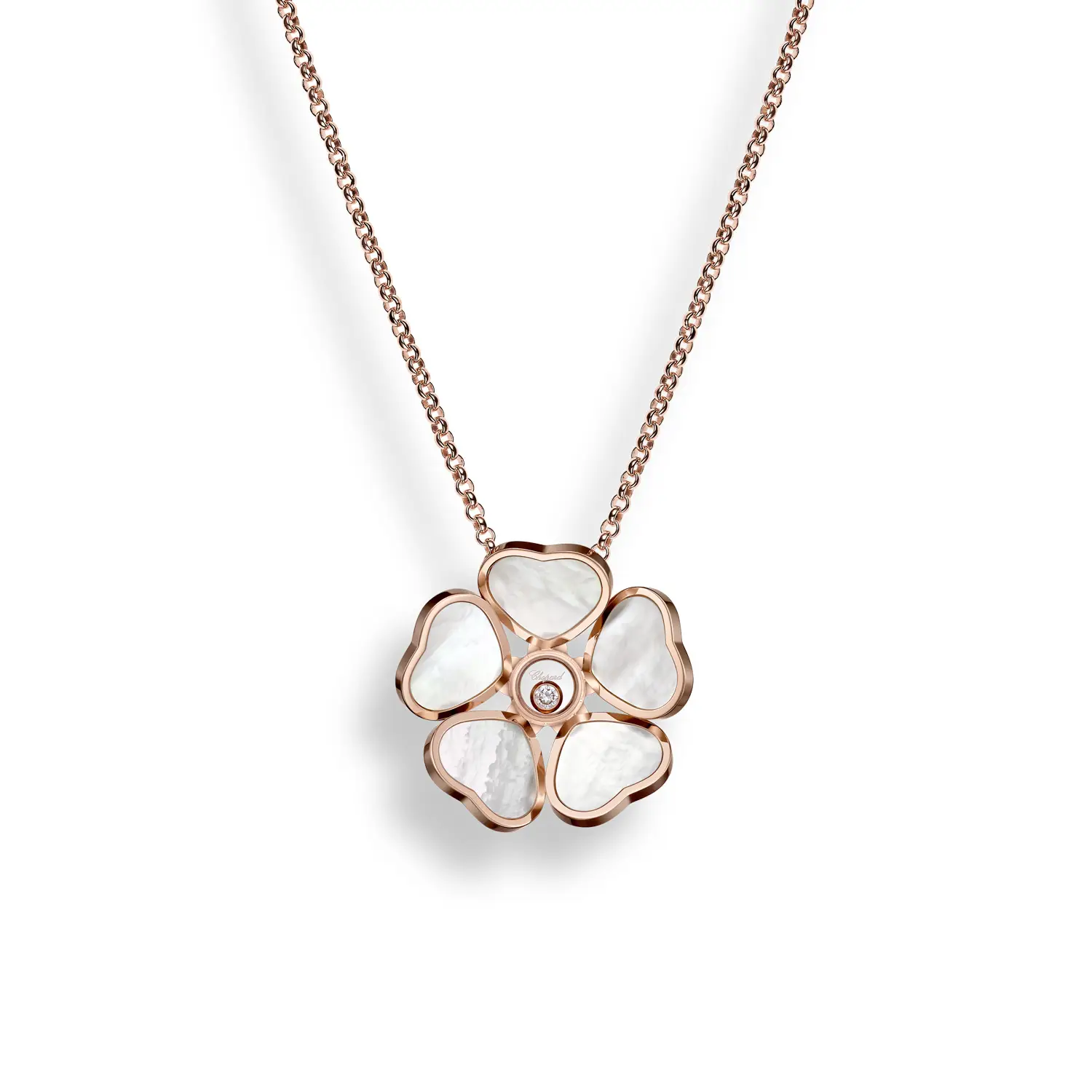Přívěsek Chopard Happy Hearts Flowers 79A085-5301 je poctou radosti, lásce a jemné ženskosti. Vyroben z 18karátového etického růžového zlata, tvoří jej motiv stylizovaného květu složeného z pěti srdcí, která se setkávají kolem volně pohybujícího se diamantu. Tento ikonický efekt „tančícího diamantu“ dodává šperku jiskru a život, symbolizuje svobodu a optimismus, který je s kolekcí Happy Hearts neodmyslitelně spjat.