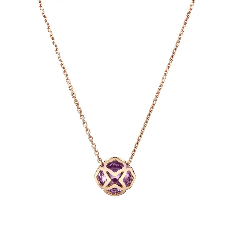 V centru pozornosti je ohromující přírodní ametyst ve výbrusu polštářku (cushion) o váze 2,74 ct, jehož sytá fialová barva a broušený tvar dodat přívěsku výraz, noblesu a drahocenný třpyt. Tento jeden výrazný kámen představuje absolutní minimalistickou extravaganci, elegantně zasazenou do luxusního kovu.