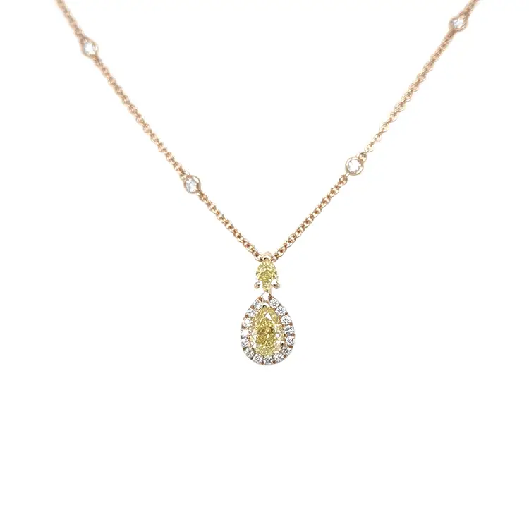 V centru šperku září přírodní fancy žlutý diamant o váze 0,71 ct v brusu hruška/slza o velikosti 7,00 × 4,60 mm, doplněný menším přírodním fancy žlutým diamantem o váze 0,23 ct a rozměrech 4,10 × 3,10 mm, rovněž v tvaru hrušky. Jejich teplý tón nádherně kontrastuje s jemným pavé z 26 přírodních bílých diamantů o celkové váze 0,40 ct v kulatém brusu (1,00–2,00 mm), s čistotou VS a barvou F. Precizní kombinace barevných diamantů vytváří sofistikovaný šperk, který podtrhne ženskost, eleganci a výjimečnost své nositelky.