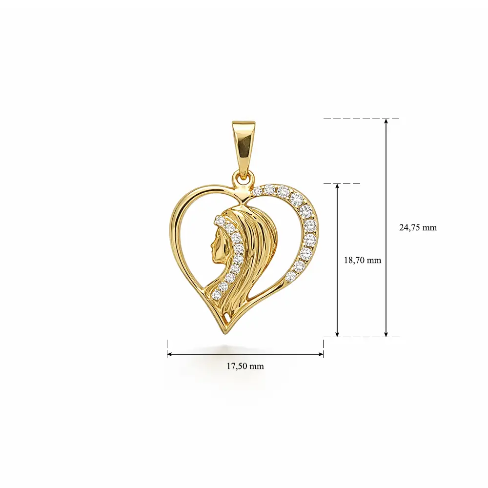 Tento zlatý přívěsek Madonka v srdci se zirkony je jemným symbolem ochrany, víry a lásky. Precizně zpracovaný motiv Panny Marie je zasazen do elegantního tvaru srdce, které je po jedné straně zdobeno třpytivými zirkony. Kombinace lesklého zlata a jemného kamínkového osazení dodává přívěsku decentní, ale výrazný vzhled.