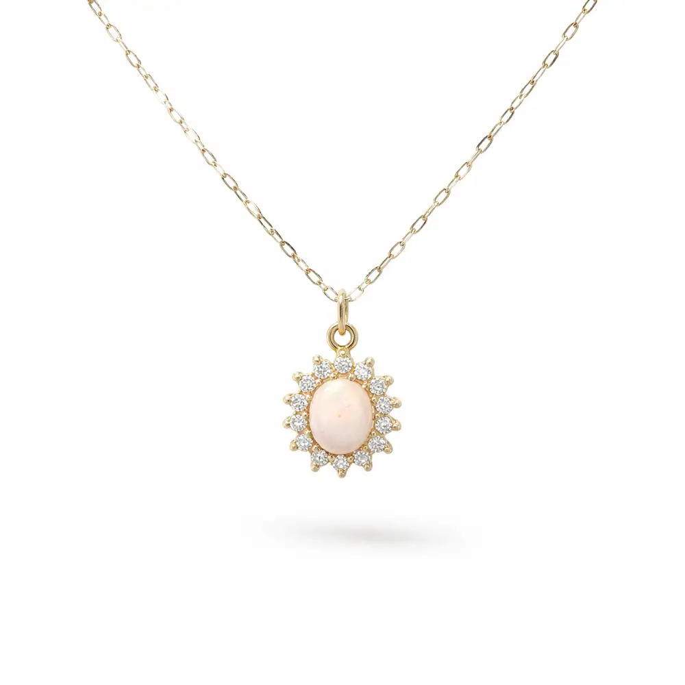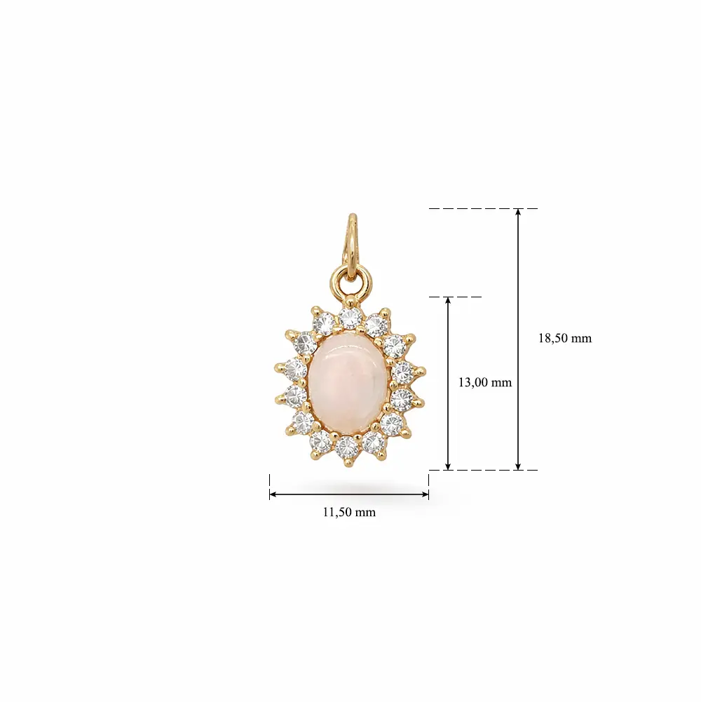 Zlatý přívěsek s opálem a zirkony působí jemně a elegantně díky harmonickému spojení hladkého oválného opálu a třpytivého osazení zirkony v okolí. Precizně zpracované zlato zvýrazňuje přirozenou krásu centrálního kamene a dodává šperku nadčasový vzhled, který je decentní, ale zároveň nepřehlédnutelný.