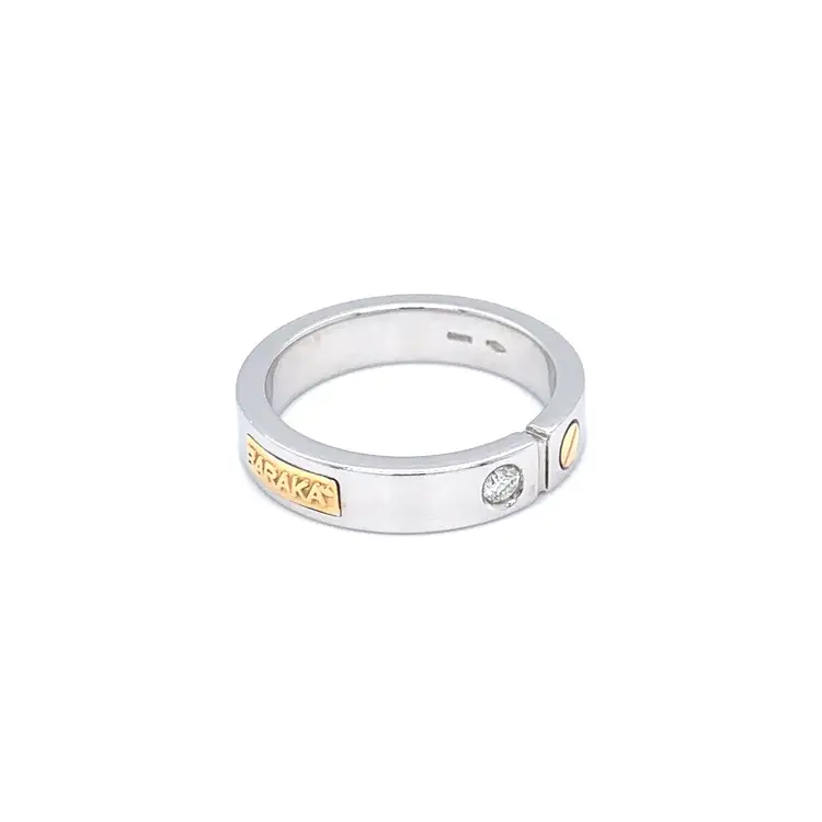 Prsten Baraka s diamantem je elegantním a nadčasovým šperkem pro ty, kteří oceňují jemný luxus. Je vyroben z kombinovaného zlata 18 kt (750/1000) s lesklou povrchovou úpravou, která zdůrazňuje čistotu designu.