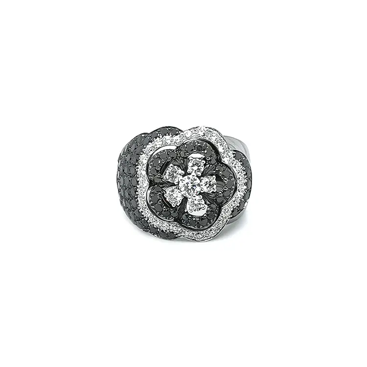 O třpyt se starají přírodní černé diamanty 1,66 ct (75 ks) v kulatém / Round brusu o 1,80 mm, které rámují a tvarují květinový motiv. Kontrast a brilanci dodává lem přírodních bílých diamantů 1,02 ct (31 ks) v kulatém / Round brusu (1,55–2,30 mm, čistota SI, barva G). Precizní osazení a dialog tmavých a světlých kamenů vytváří luxusní, nadčasový a skutečně nepřehlédnutelný prsten.