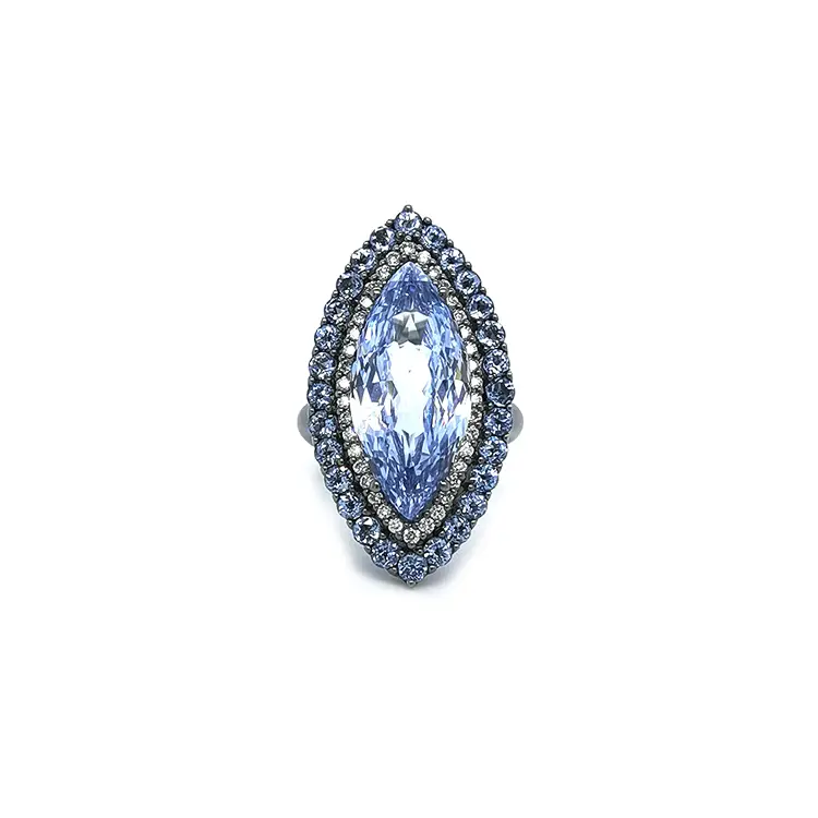 Dominantou kompozice je přírodní topaz 1,10 ct (1 ks) v brusu markýza / Marquise o rozměrech 22,50 × 10,20 mm, v syté modré barvě. Hloubku barev zvýrazňuje věnec topazů (28 ks, kulatý / Round, Ø 3,05 mm, přírodní). O jiskru a kontrast se starají přírodní diamanty 0,38 ct (38 ks) v kulatém / Round brusu o Ø 1,35 mm, bílé barvy, s čistotou SI a barvou G. Výsledkem je luxusní, výrazný a nadčasový prsten, který se stane dominantou každého outfitu.