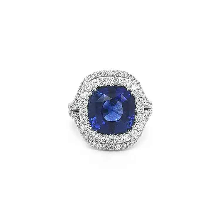 Centrem kompozice je přírodní safír 7,67 ct (1 ks) v brusu polštářek / Cushion o rozměrech 11,35 × 11,05 mm, v sytě modré barvě. Jiskru a kontrast dodává pavé přírodních diamantů 1,29 ct (88 ks) v kulatém / Round brusu (1,70–2,30 mm), bílé barvy s čistotou SI a barvou G. Precizní osazení zvýrazňuje hloubku safíru i brilanci diamantů – výsledkem je luxusní, výrazný a nadčasový prsten, který se stane dominantou vaší šperkovnice.