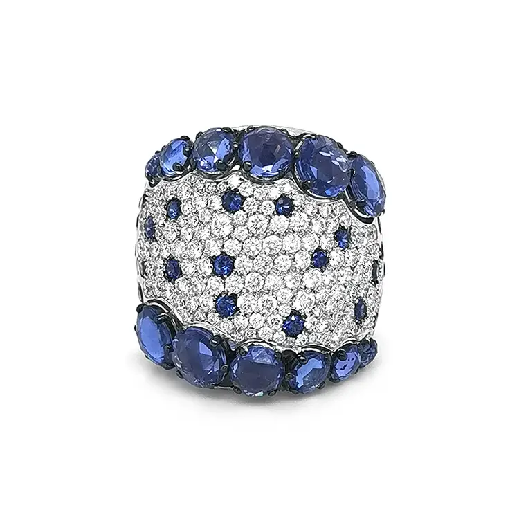 Dominantní ozdobou je soubor 44 přírodních modrých safírů o celkové váze 5,62 ct v kulatém routovém / rose cut brusu s rozměry 1,80–6,40 mm, doplněný o další přírodní kulatý safír o váze 1,28 ct. Jejich sytou barvu nádherně vyvažuje pavé z přírodních bílých diamantů o váze 1,98 ct v kulatém brusu, s čistotou SI a barvou G. Spojení safírů a diamantů dodává šperku dynamiku a brilanci, díky nimž se stává symbolem luxusu, originality a výjimečného stylu.