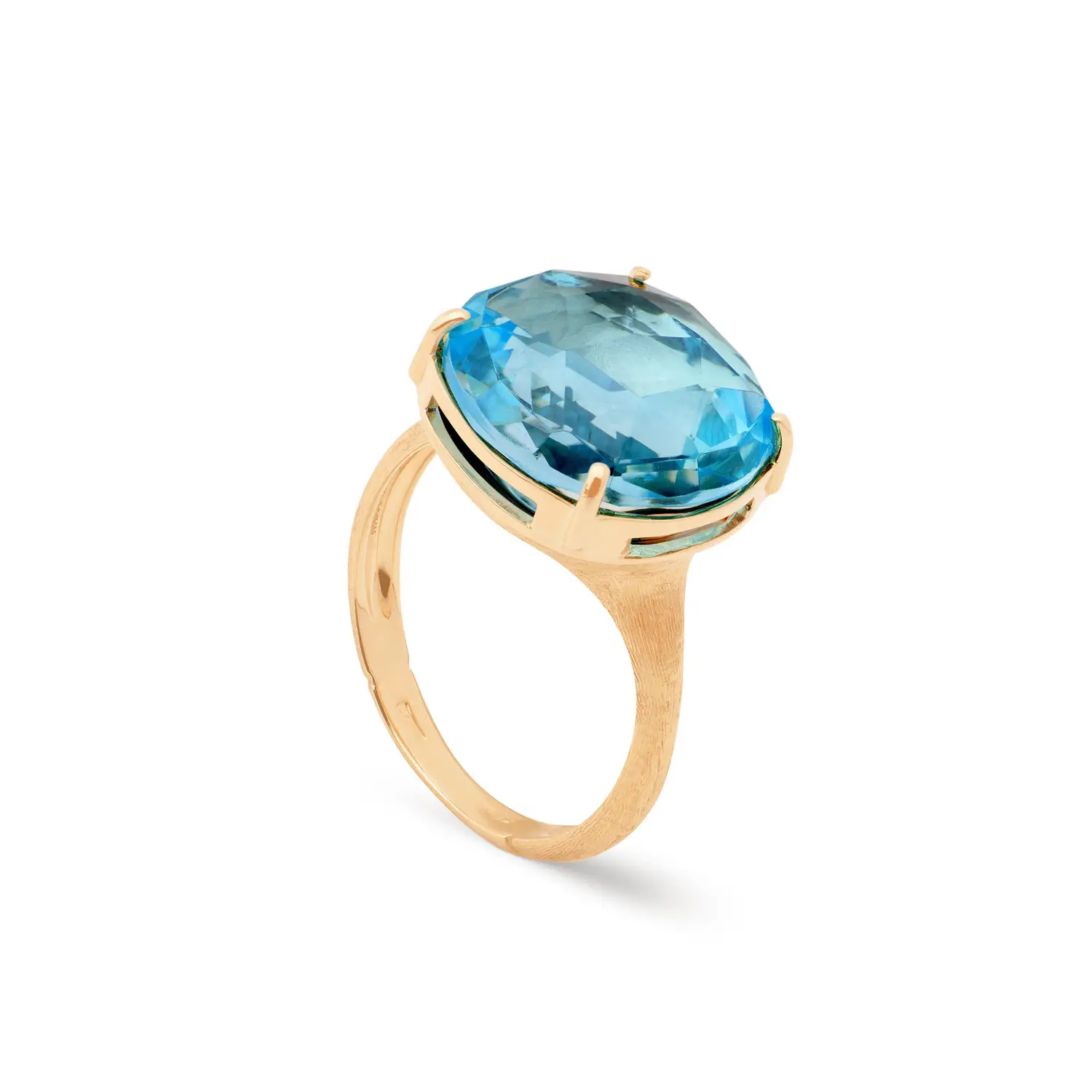 Obroučka z 18K žlutého zlata je dekorována ruční rytinou bulino, která vytváří organicky matný povrch s hedvábným efektem. Tato technika, prováděná výhradně ručně, je typická pro Marco Bicego a činí každý kus originálním. Klenotnické zpracování nechává vyniknout jak barvu topazu, tak sametovou texturu zlata.