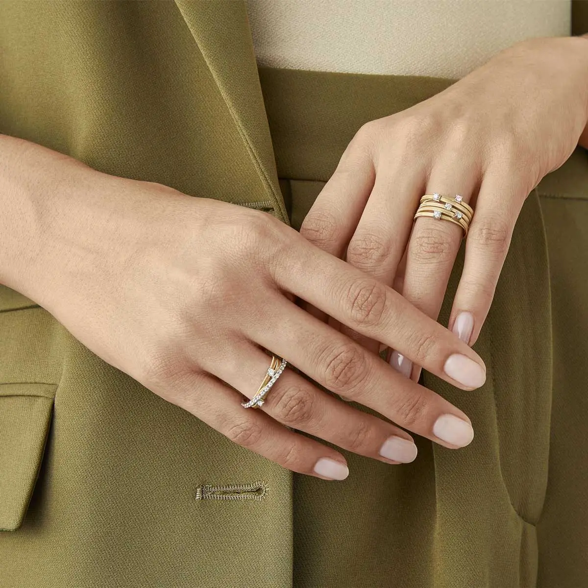 Každý kousek kolekce je vytvořen technikou ručního zpracování, kdy se zlaté proužky jemně tvarují a překrývají, aby vznikl efekt přirozeného pohybu a měkkosti. Goa je k dispozici v provedení ze žlutého, bílého i růžového zlata, často doplněného o třpytivé diamanty, které podtrhují architektonickou čistotu designu.