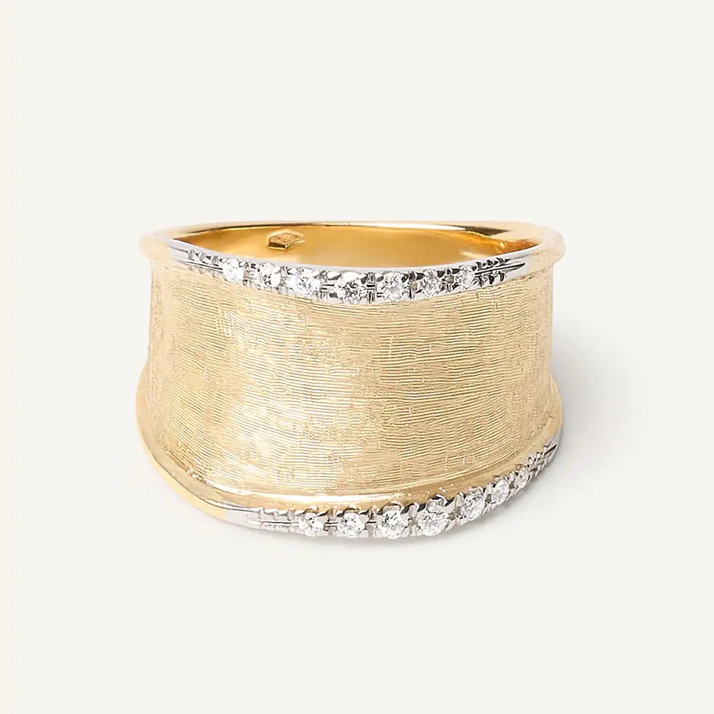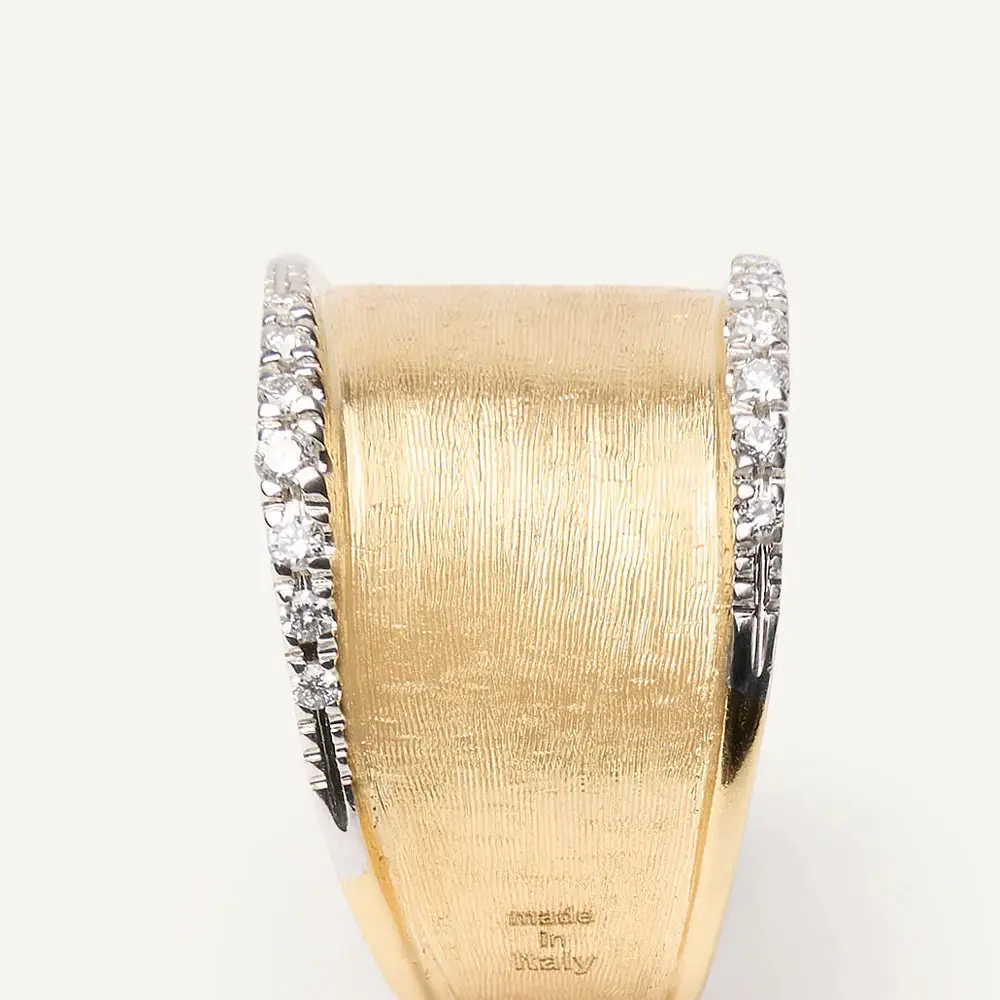 Prsten Marco Bicego Lunaria AB550 B YW Q6 v sobě spojuje jemnost a oslnivost římského stylu. Je vyroben z kombinovaného zlata 18 kt (750/1000) a zdobí jej ručně ryté motivy kolekce Lunaria, které dávají šperku jemnou texturu a osobitý vzhled.