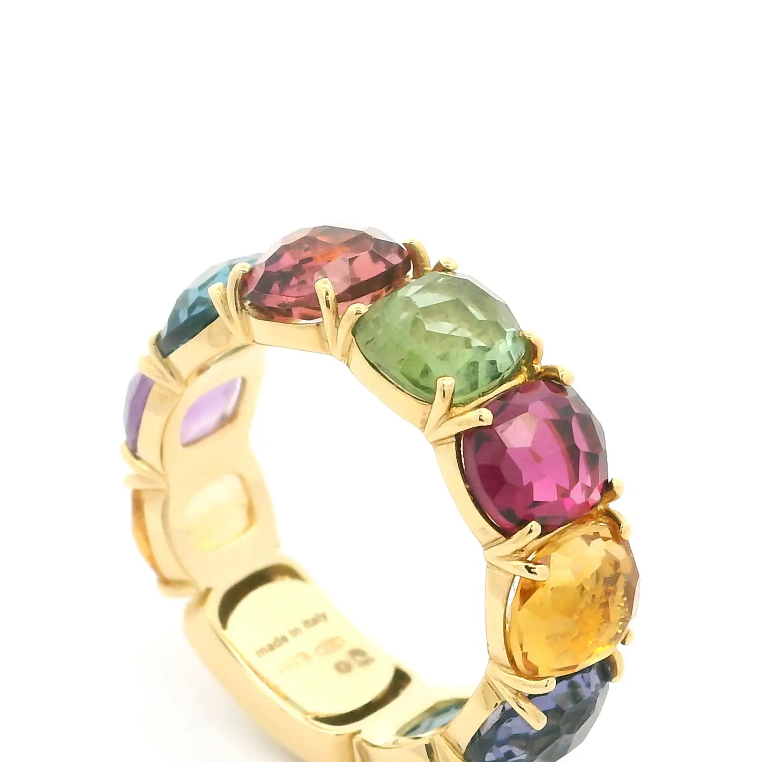 Tento prsten z kolekce Marco Bicego Murano oslňuje paletou pečlivě vybraných barevných drahokamů, které vytvářejí harmonický barevný přechod inspirovaný živostí Benátek. Každý kámen je ručně fasován do 18K žlutého zlata a broušen tak, aby zvýraznil svůj tón, čistotu a přirozený třpyt. Výsledkem je hravý a přitom elegantní efekt, který je pro Murano jedinečný.