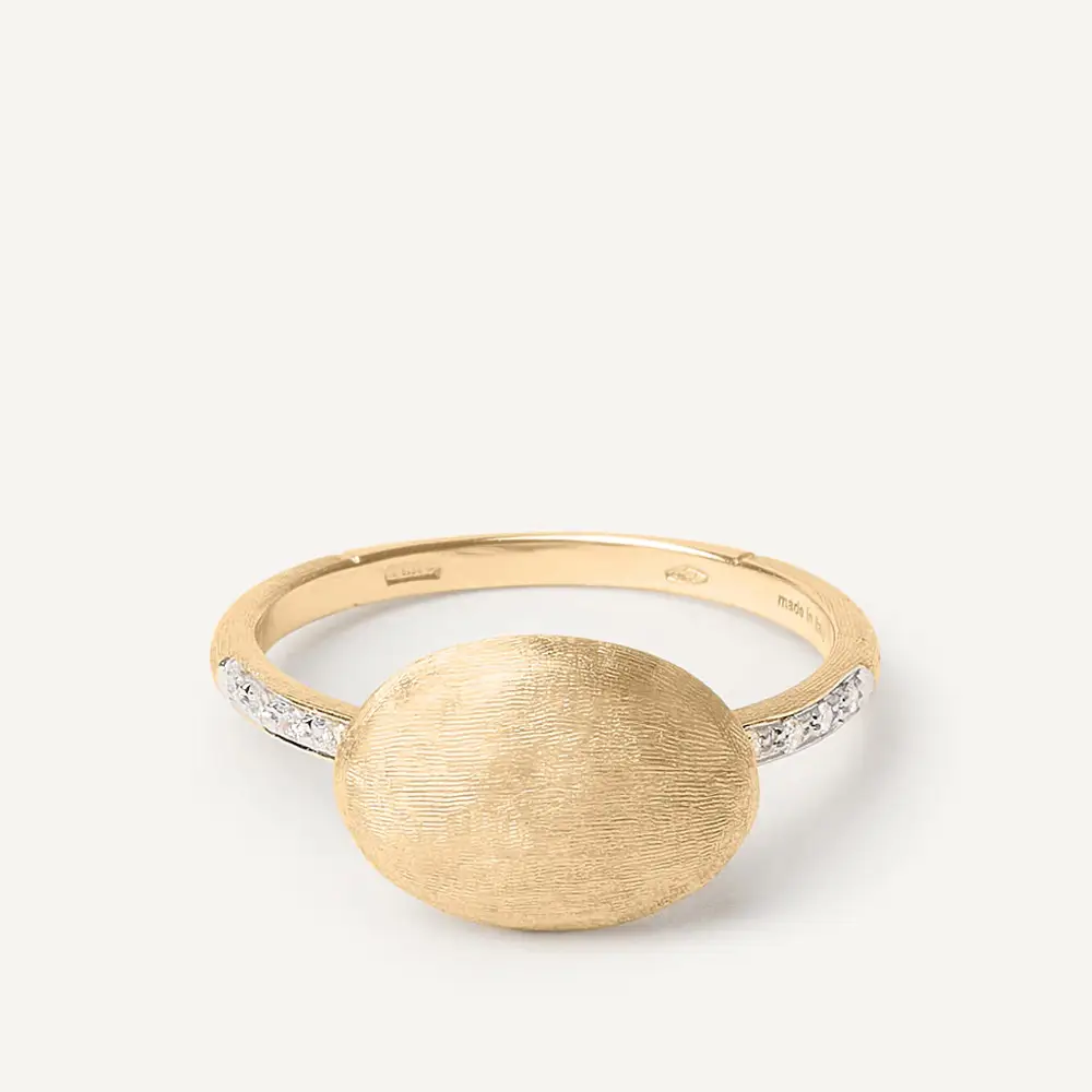 Prsten Marco Bicego Siviglia AB609 B YW představuje spojení organických linií a tradičního italského zlatnictví. Kolekce Siviglia je charakteristická oválnými destičkami inspirovanými andaluskou estetikou a tlumenou elegancí. Centrální prvek z 18K žlutého zlata má jemně nepravidelnou siluetu a ručně rytou saténovou úpravu, která vytváří sofistikovanou texturu.