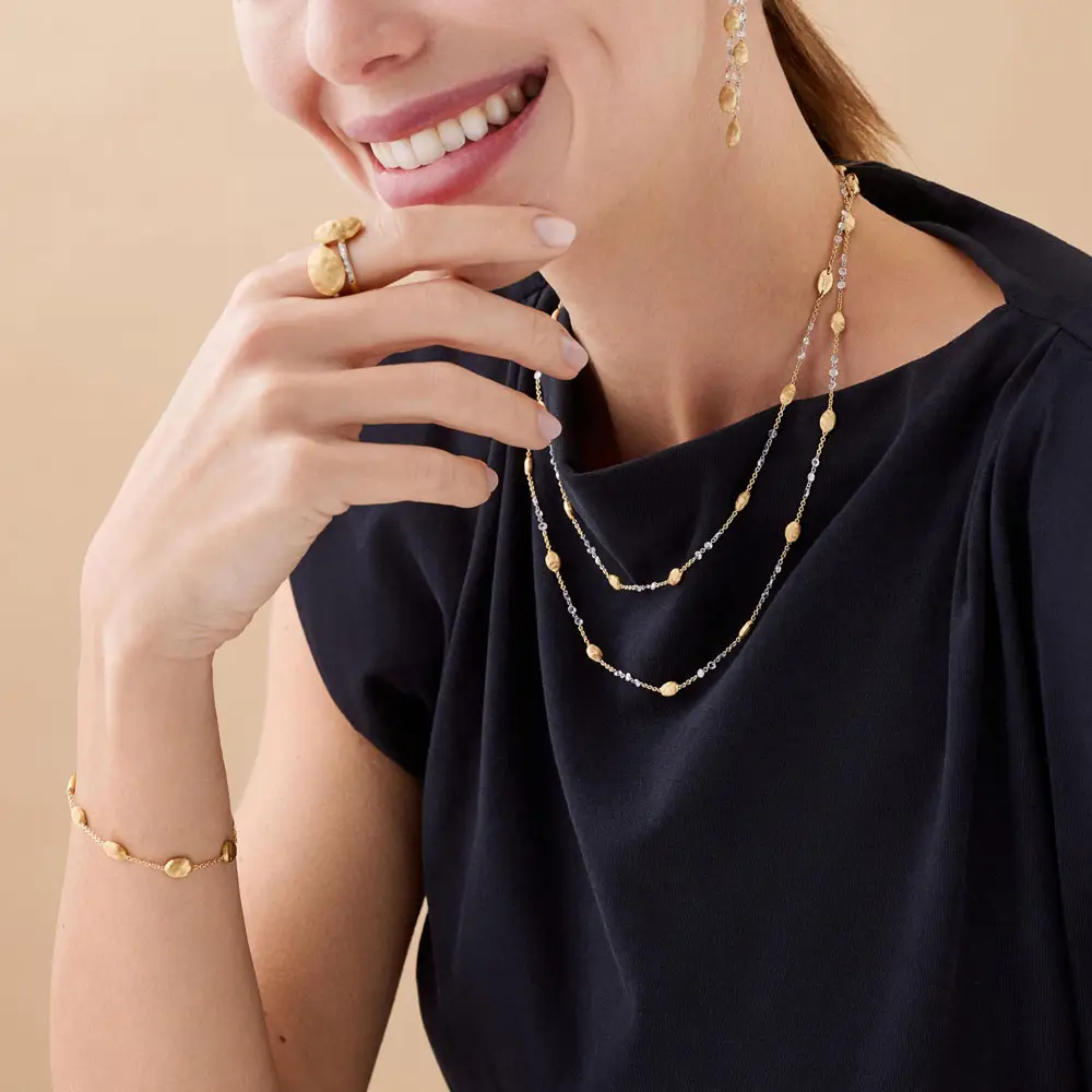 Každý prvek je vyroben ručně v ateliérech Marco Bicego a zdoben technikou ručního rytí bulino, jež vytváří sametově matný povrch. Jemné destičky jsou propojeny lehkými řetízky, které působí vzdušně a přizpůsobují se pohybu těla. Kolekce Siviglia nabízí náhrdelníky, náramky, náušnice i prsteny, doplněné diamanty pro ještě větší sofistikovanost.