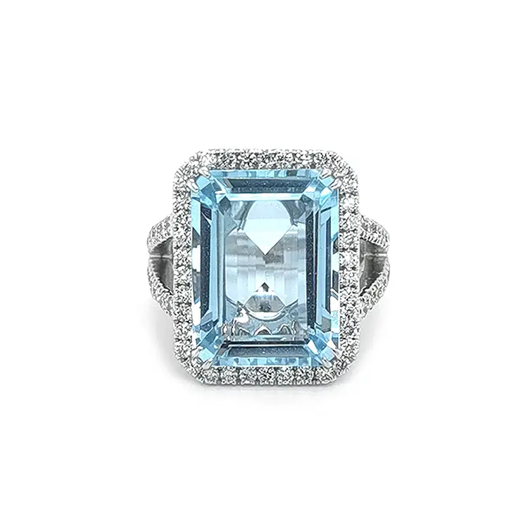 Centrem kompozice je akvamarín 10,20 ct (1 ks) v brusu tvar smaragdu / Emerald o rozměrech 15,80 × 11,85 mm, v čisté modré barvě (původ: přírodní). Jiskru a kontrast dodává pavé přírodních diamantů 0,97 ct (72 ks) v kulatém / Round brusu o 2,00 mm, bílé barvy, s čistotou SI a barvou G. Precizní osazení nechává vyniknout hloubku akvamarínu i brilanci diamantů – výsledkem je luxusní, výrazný a nadčasový prsten pro výjimečné příležitosti.