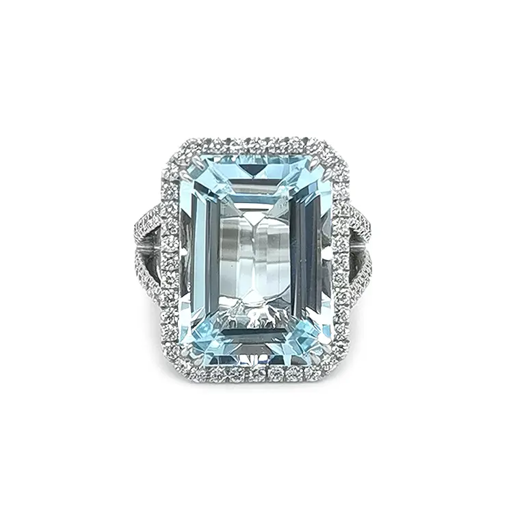 Centrem kompozice je akvamarín 14,22 ct (1 ks) v brusu tvar smaragdu / Emerald o rozměrech 18,80 × 12,85 mm, v čisté modré barvě (původ: přírodní). Jiskru a kontrast dodává pavé přírodních diamantů 0,95 ct (80 ks) v kulatém / Round brusu o 1,20 mm, bílé barvy s čistotou SI a barvou G. Precizní osazení zvýrazňuje hloubku akvamarínu i brilanci diamantů – výsledkem je luxusní, nadčasový a skutečně výrazný prsten pro výjimečné příležitosti.