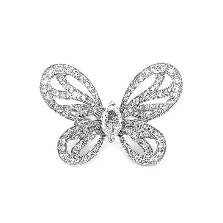 V srdci prstenu září briliant tvaru markýzy o rozměrech 10,00 × 5,00 mm, váze 1,02 ct, barvě E a čistotě VS2. Okřídlený motiv je dále osazen 130 přírodními diamanty v kulatém brusu Round, o celkové hmotnosti 3,37 ct, velikosti 1,70 mm, barvy G a čistoty VS2. Lesk těchto kamenů vytváří efekt třpytivého pohybu – jako by se křídla motýla právě chystala vzlétnout.