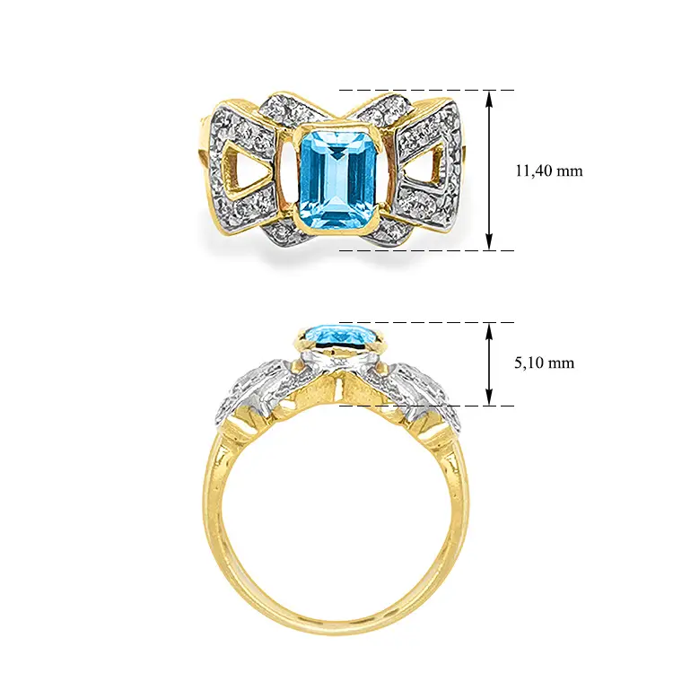 Celkový lesk a harmonie jsou umocněny 24 bílými kubickými zirkony kulatého tvaru o rozměrech 1,20–1,30 mm, které dodávají prstenu kouzelný třpyt a dynamiku světla. Tento šperk je ideální pro ženu, která miluje moderní design, výrazné barevné akcenty a nakládá s luxusem i každodenním stylem.