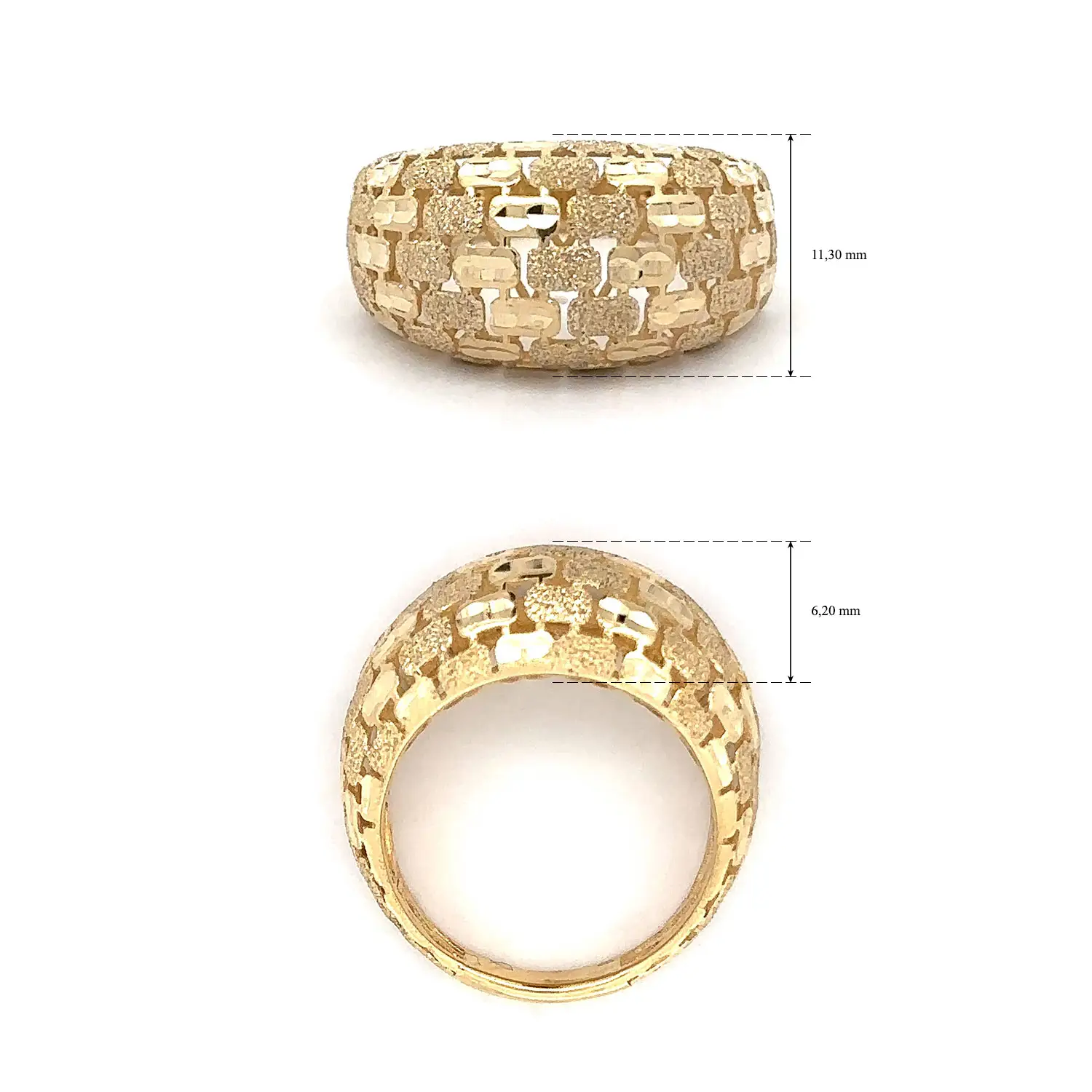 Tento výrazný zlatý prsten s mozaikovou strukturou vyniká svým unikátním designem, který kombinuje hladké lesklé plochy s jemně pískovanými detaily. Společně vytvářejí působivý efekt hry světla, díky kterému prsten okamžitě zaujme svou texturou a hloubkou. Šperk je vyroben z kvalitního žlutého zlata, které mu dodává teplý tón a nadčasový charakter, a jeho plnější tvar elegantně obepíná prst.