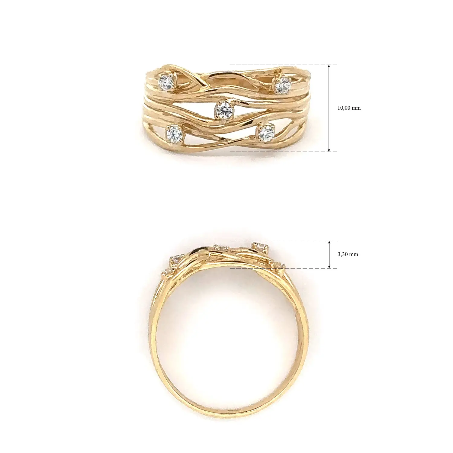 Tento elegantní zlatý prsten s propleteným designem okouzlí svým lehkým, organickým vzhledem, který připomíná jemně splétané větvičky. Do struktury jsou zasazeny zářivé zirkony, jejichž čistý třpyt krásně ladí s teplým odstínem žlutého zlata. Strategické rozmístění kamenů dodává prstenu vzdušnost, hravost i jemný ženský půvab.
