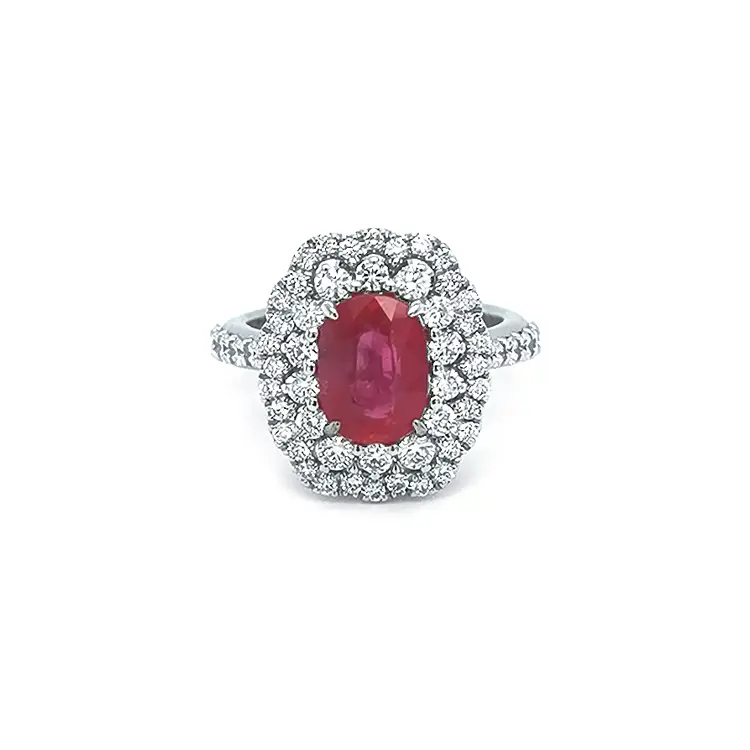 Centrem pozornosti je přírodní rubín 2,05 ct (1 ks) ve tvaru ovál / Oval o rozměrech 6,70 × 6,65 mm, v intenzivní červené barvě. O jiskru a kontrast se starají přírodní diamanty 1,11 ct (60 ks) v kulatém / Round brusu (1,80–2,20 mm), bílé barvy, s čistotou SI a barvou G. Precizní osazení zvýrazňuje sytost rubínu i brilanci diamantů – výsledkem je luxusní, výrazný a nadčasový zásnubní prsten, který promění vyznání lásky v nezapomenutelný okamžik.