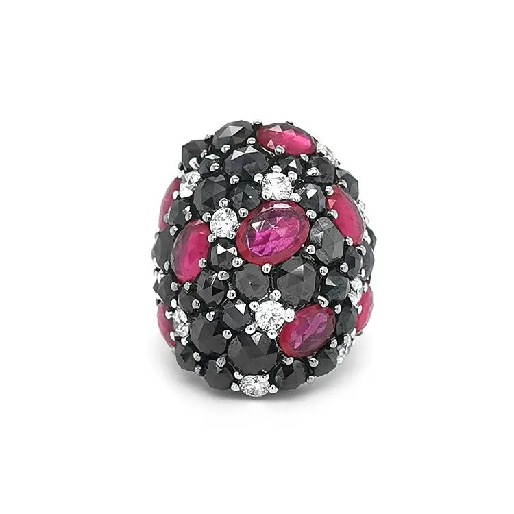 Tento výrazný prsten z 18kt černého zlata 750/1000 s rutheniovým povrchem působí jako skutečný klenot moderní extravagance. Lesklý povrch a robustní kompozice podtrhují kontrast mezi temnými a sytě červenými tóny kamenů, čímž vzniká šperk, který okamžitě přitáhne pozornost a stane se dominantou každého stylingu.