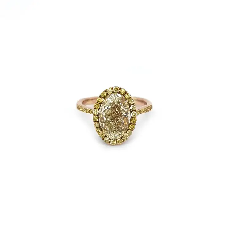 Dominantou šperku je přírodní žlutý diamant o hmotnosti 3,21 ct, vybroušený do tvaru oválu o rozměrech 10,99 × 7,47 × 5,01 mm a čistoty VS2. Jeho sytý zlatavý odstín dodává prstenu sluneční jas a mimořádnou hloubku. Celek doplňují menší žluté diamanty o celkové hmotnosti 0,35 ct, které zvýrazňují centrální kámen a umocňují dojem luxusu.