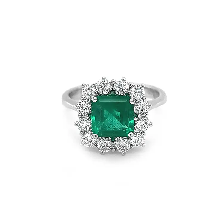 Smaragd je drahokam, který upoutá svým netypickým zeleným zbarvením. Přední místo v klenotnickém světě nezískal pouze díky originální barvě, ale i pro své výjimečné vlastnosti. Šperky, jež jsou jím ozdobené, jsou určené pro výrazné a sebevědomé ženy, které chtějí zářit nejen během nezapomenutelných událostí, ale i ve všedních chvílích. Prsten se smaragdem je vyrobený z bílého 18karátového zlata a zdobí ho spousta drobných diamantů.