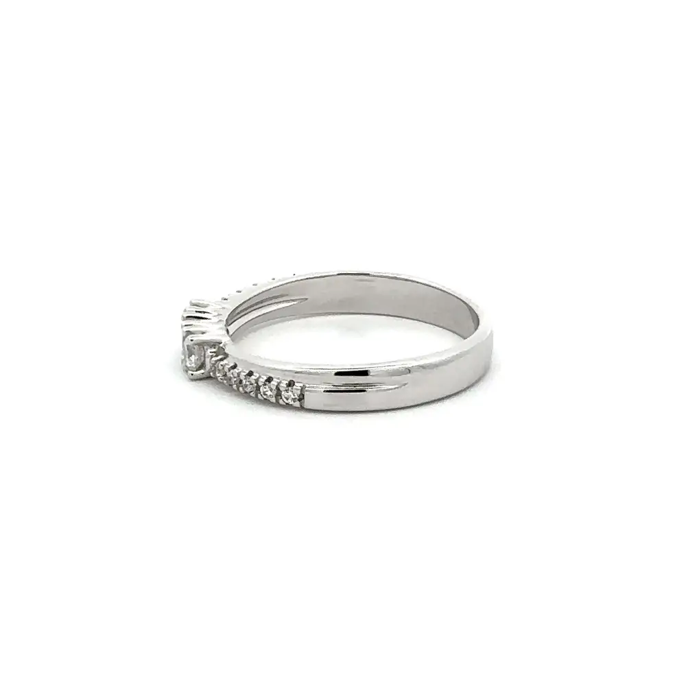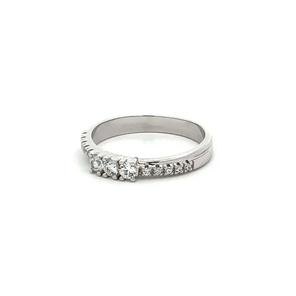 Boční osazení drobnými zirkony jemně navazuje na hlavní kameny a umocňuje celkový lesk prstenu, aniž by působil výrazně. Tenká obroučka zajišťuje pohodlí při nošení a podtrhuje lehkost celého provedení. Tento prsten je ideální volbou pro ženy, které hledají elegantní šperk s jemným třpytem a univerzálním charakterem pro každodenní i slavnostní příležitosti.