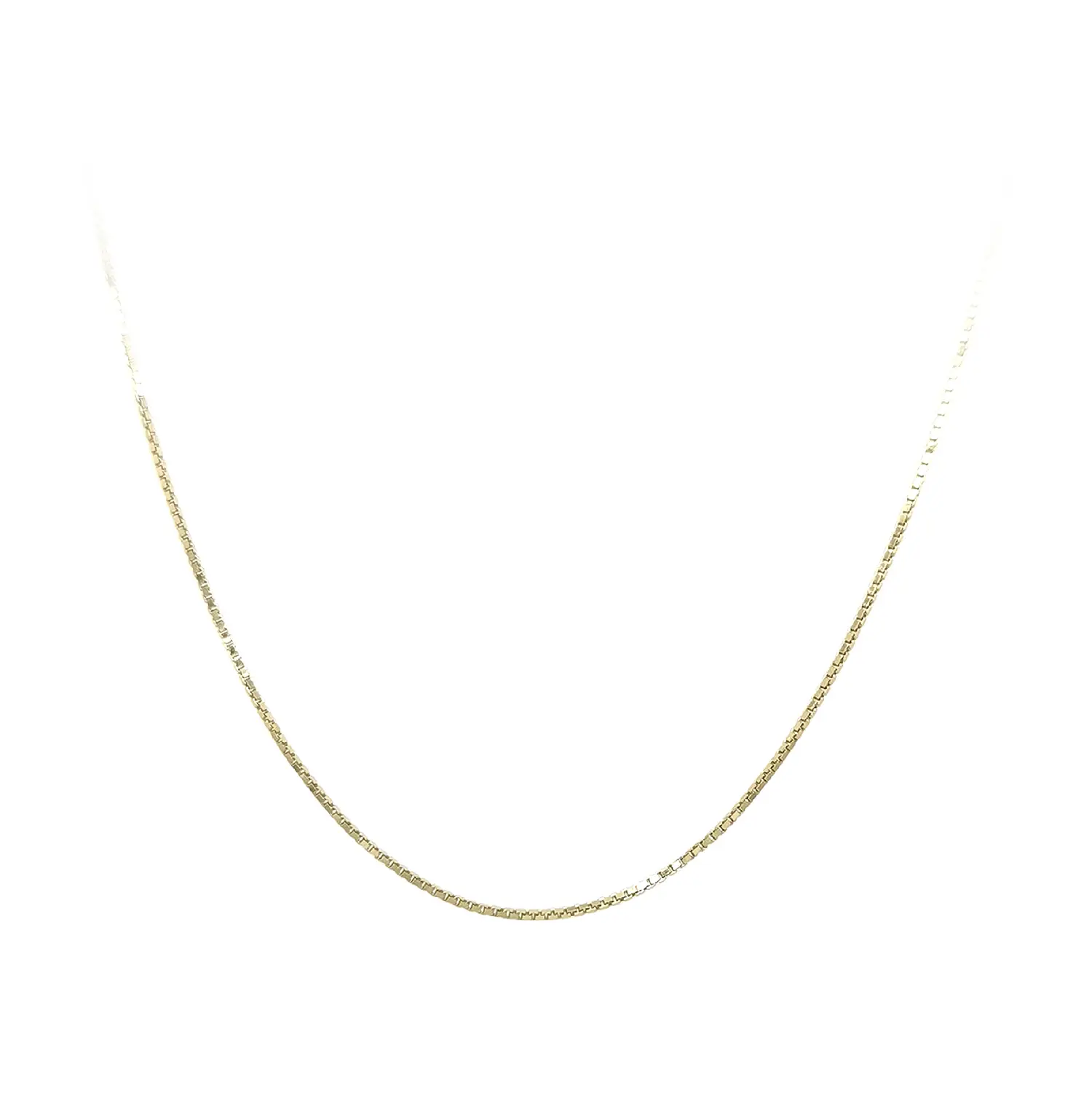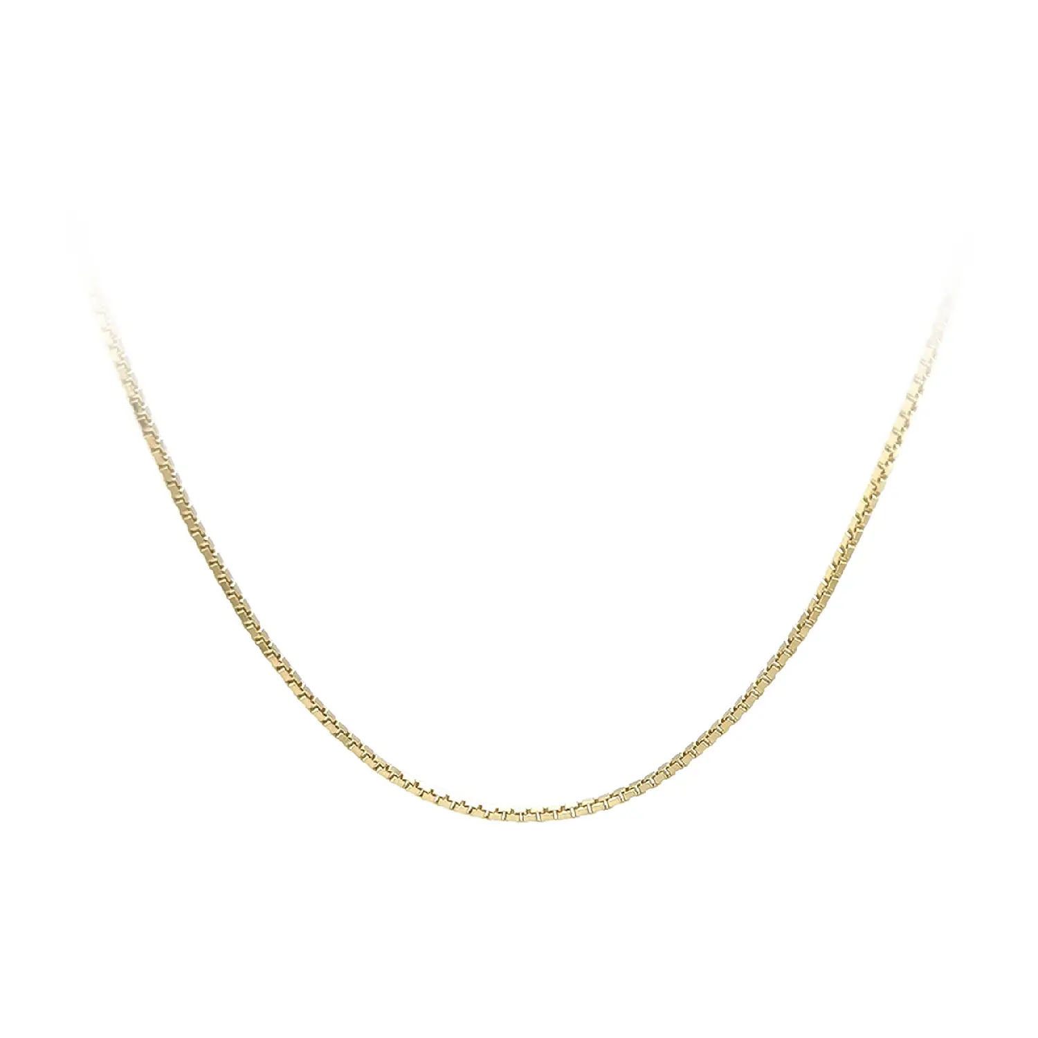 Zlatý řetízek Box zaujme precizní strukturou drobných čtvercových oček, která vytvářejí hladkou, kompaktní linii s jemným, elegantním leskem. Díky svému minimalistickému charakteru působí velmi čistě a nadčasově, takže skvěle doplní každodenní outfit i formální styling.