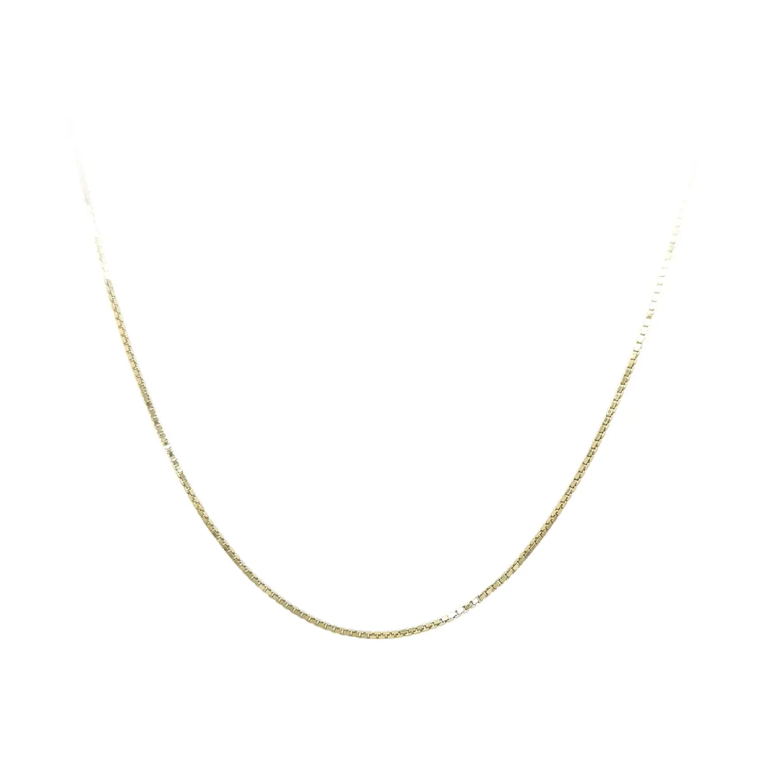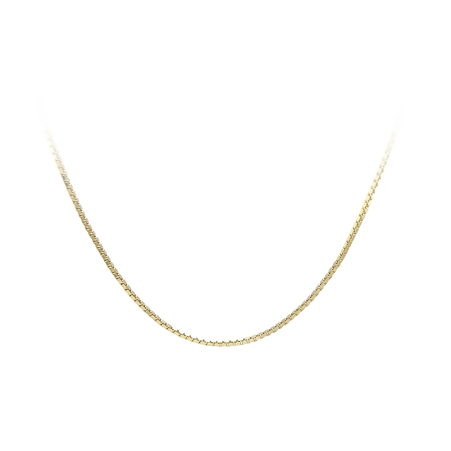 Zlatý řetízek ve vzoru Box se vyznačuje pravidelnými čtvercovými články, které vytvářejí čistý, moderní a nadčasový vzhled. Díky jemnému provedení a šířce 0,80 mm působí velmi decentně a elegantně, což z něj činí ideální volbu pro minimalistický styl i každodenní nošení.