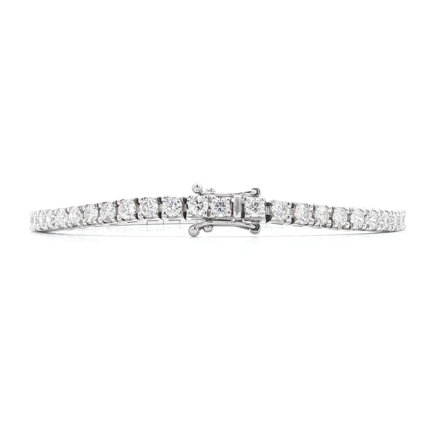Náramek zdobí 52 přírodních diamantů typu Round o celkové hmotnosti 5,41 ct. Každý diamant o průměru 2,50 mm vyniká barvou G a čistotou VS, díky čemuž dosahuje výjimečné brilance a jasnosti. Bílý kov umocňuje jejich přirozený lesk, čímž vzniká jemná, plynulá linie světla obklopující zápěstí.