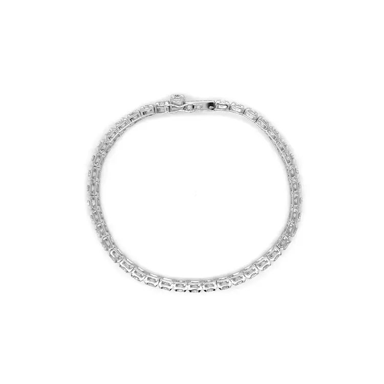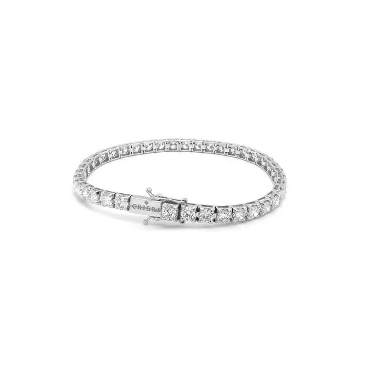 Dominantou náramku jsou přírodní bílé diamanty v kulatém briliantovém brusu (Round) o celkové hmotnosti 6,45 ct. Diamanty mají barvu G–H a čistotu VS, což znamená mimořádný lesk a výjimečnou kvalitu. Každý kámen je pečlivě zasazen ručně, aby vytvořil souvislou linii dokonalého třpytu – tzv. „řeku světla“. Tento efekt činí z náramku šperk, který září při každém pohybu.