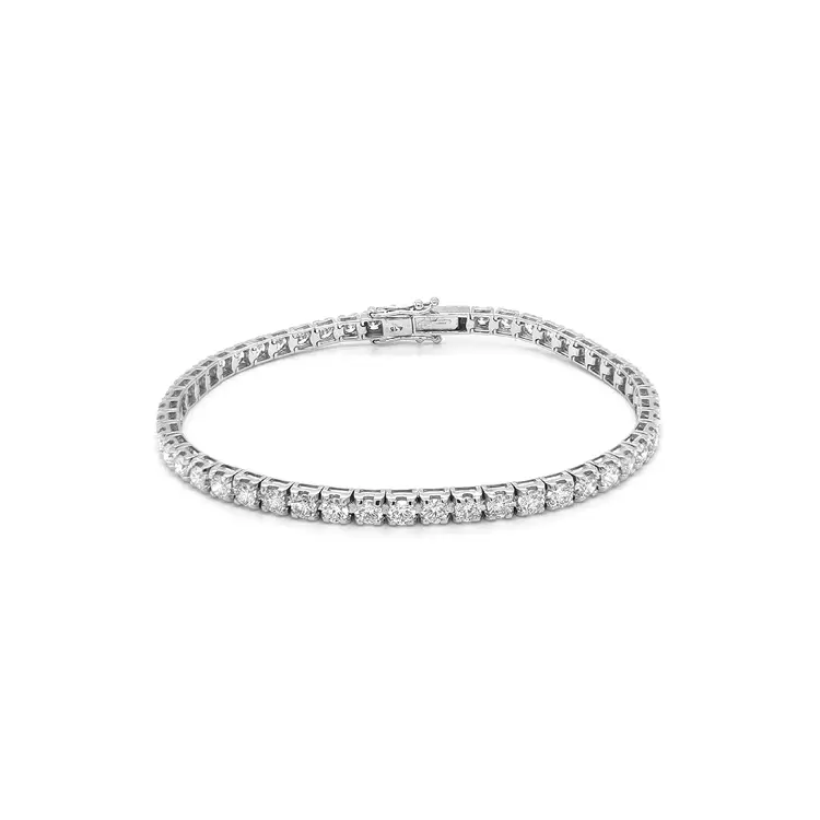 Náramek je osazen přírodními bílými diamanty v kulatém brusu (Round) o celkové karátové hmotnosti 4,15 ct, s barvou G–H a čistotou VS. Každý kámen byl pečlivě ručně zasazen, aby vytvořil nepřerušenou linii dokonalého třpytu – symbol elegance a vytříbeného vkusu. Bílá záře zlata podtrhuje brilantnost diamantů a vytváří harmonii světla a luxusu.