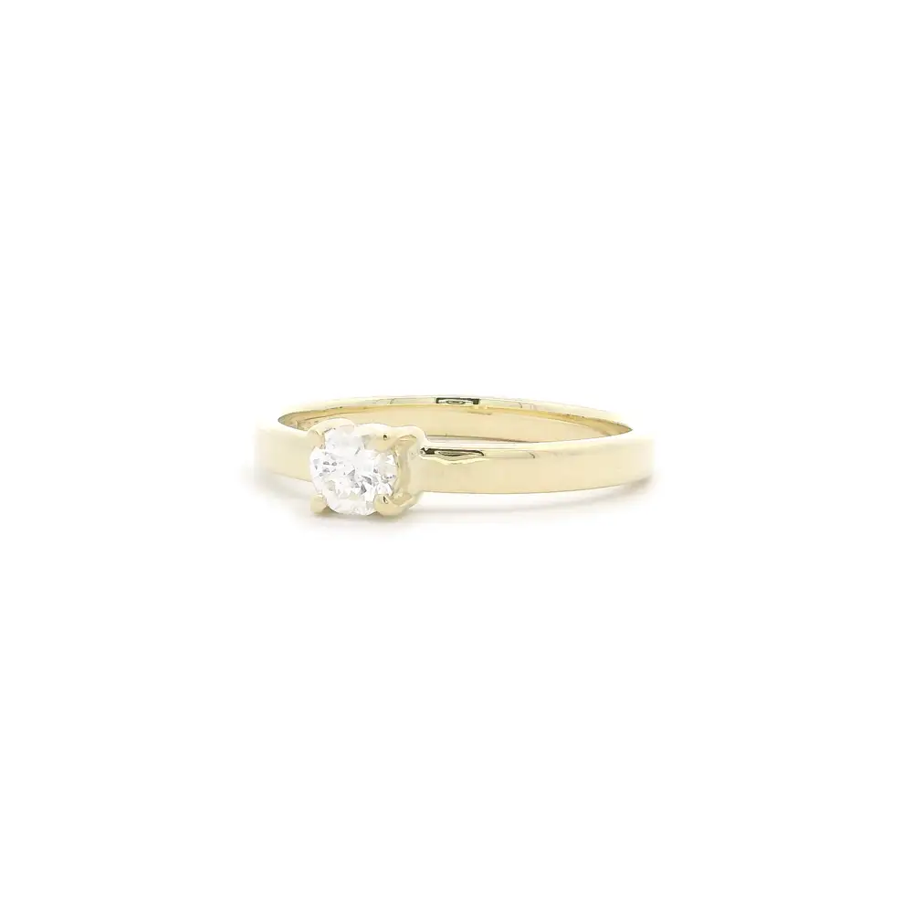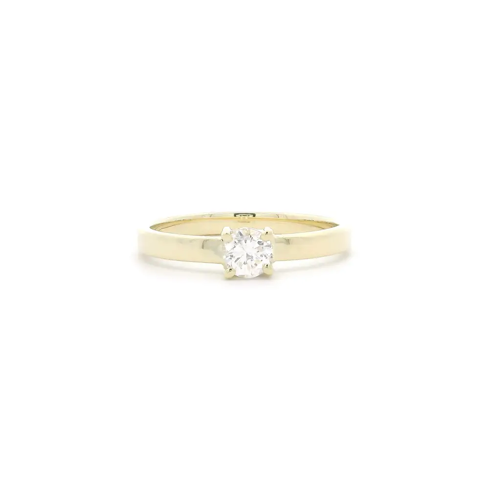 Tento zásnubní prsten ze žlutého 18kt zlata je ztělesněním nadčasové elegance a symbolu lásky. V jeho středu září solitérní diamant o váze 0,24 ct, jehož brilantní brusy zvýrazňují přirozenou krásu a jiskru kamene.